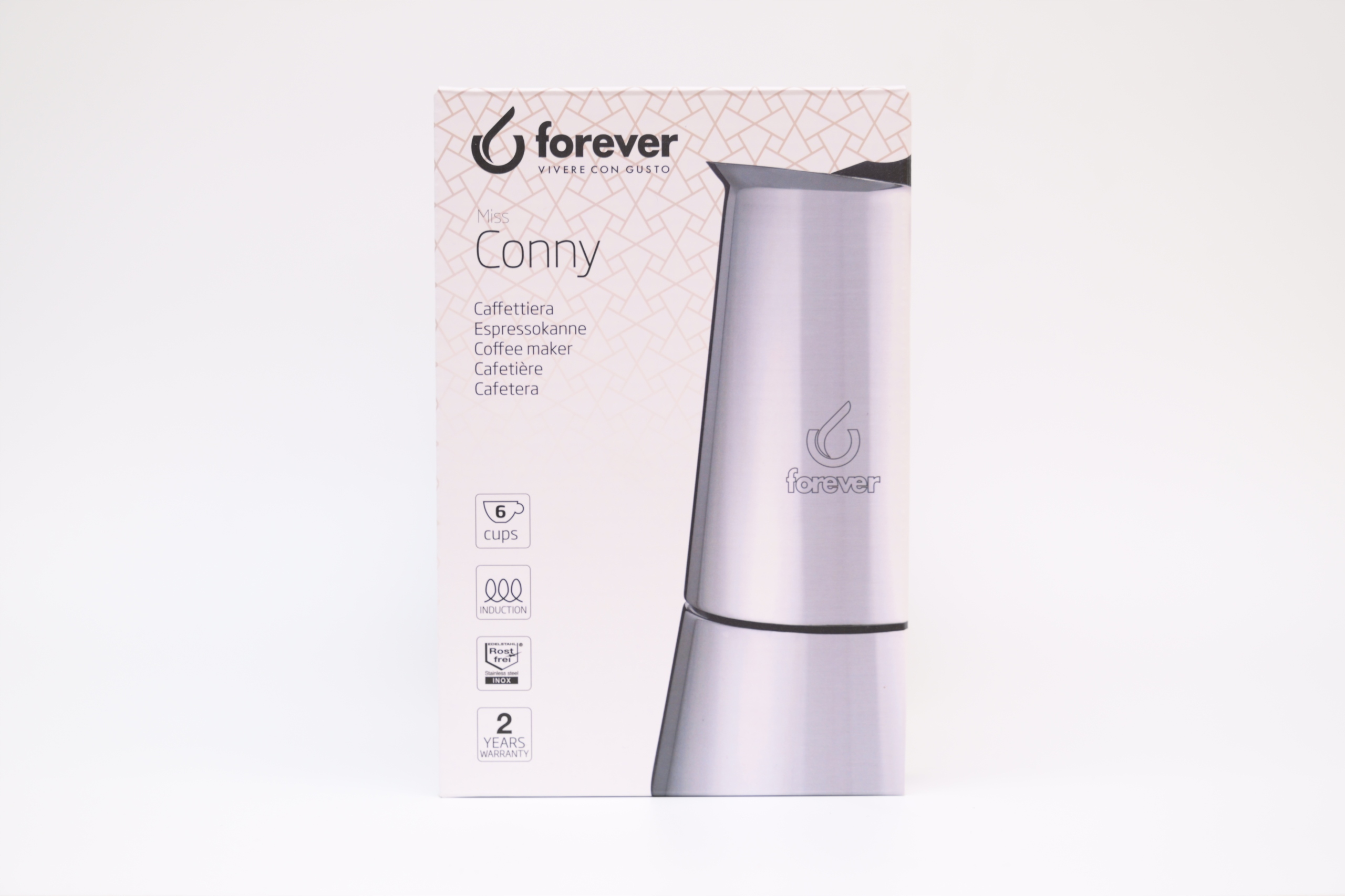 Kawiarka marki Forever Miss Conny to eleganckie i funkcjonalne urządzenie do parzenia aromatycznego espresso. Wykonana z wysokiej jakości stali nierdzewnej, co zapewnia trwałość i higienę użytkowania. Elegancja i design sprawdzą się doskonale w każdej kuchni, a okrągły kształt to konstrukcyjna zaleta. Ergonomiczny antypoślizgowy uchwyt z tworzywa sztucznego, zapewni Ci komfort i bezpieczeństwo podczas użytkowani.
