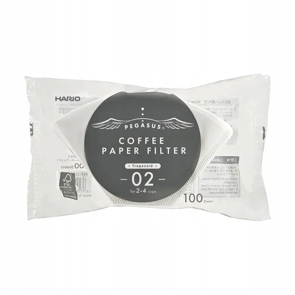 Opakowanie 100 sztuk papierowych filtrów do parzenia kawy, odpowiednich do drippera Hario PEGASUS 02. Filtry mają kształt trapezu – są zaprojektowane z myślą o dripperze trapezowym z płaskim dnem.