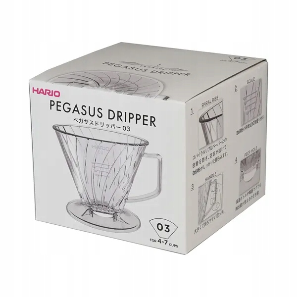 Hario PEGASUS Dripper 03 to zaparzacz do przelewowego parzenia kawy – może posłużyć do przygotowania od jednej do kilku porcji na raz. Wykonany z tworzywa sztucznego, jest lekki i wytrzymały. Od standardowego V60 odróżnia go forma – PEGASUS ma płaskie dno z dwoma otworami i stosuje się do niego filtry w kształcie trapezu.