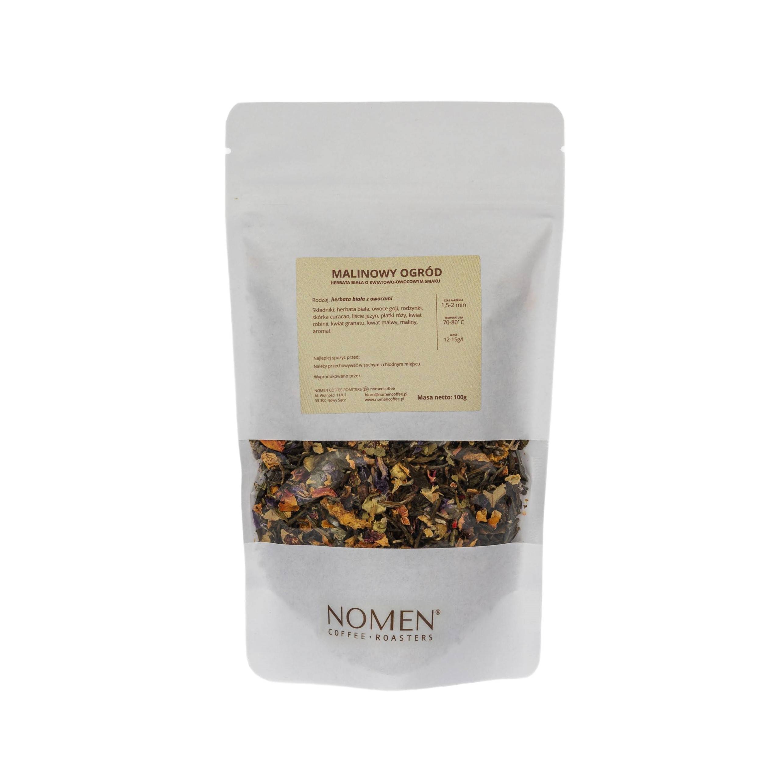 Skład: herbata biała, owoce goji, rodzynki, skórka curacao, liście jeżyn, płatki róży, kwiat robinii, kwiat granatu, kwiat malwy, maliny, aromat