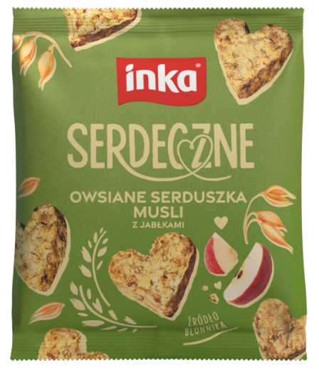 SERDECZNE JABŁKOWE zbożowe serduszka musli z dodatkiem jabłek oferują delikatną kruchość z lekką nutą kwasowości rodzimych owoców. Serdeczne od Inki wykonane są z najlepszych, naturalnych składników, a ich skład głównie opiera się na płatkach owsianych, mają więc wysoką zawartość błonnika i beta glukanów owsianych. Dostępne w poręcznych jednoporcjowych opakowaniach 50g.
