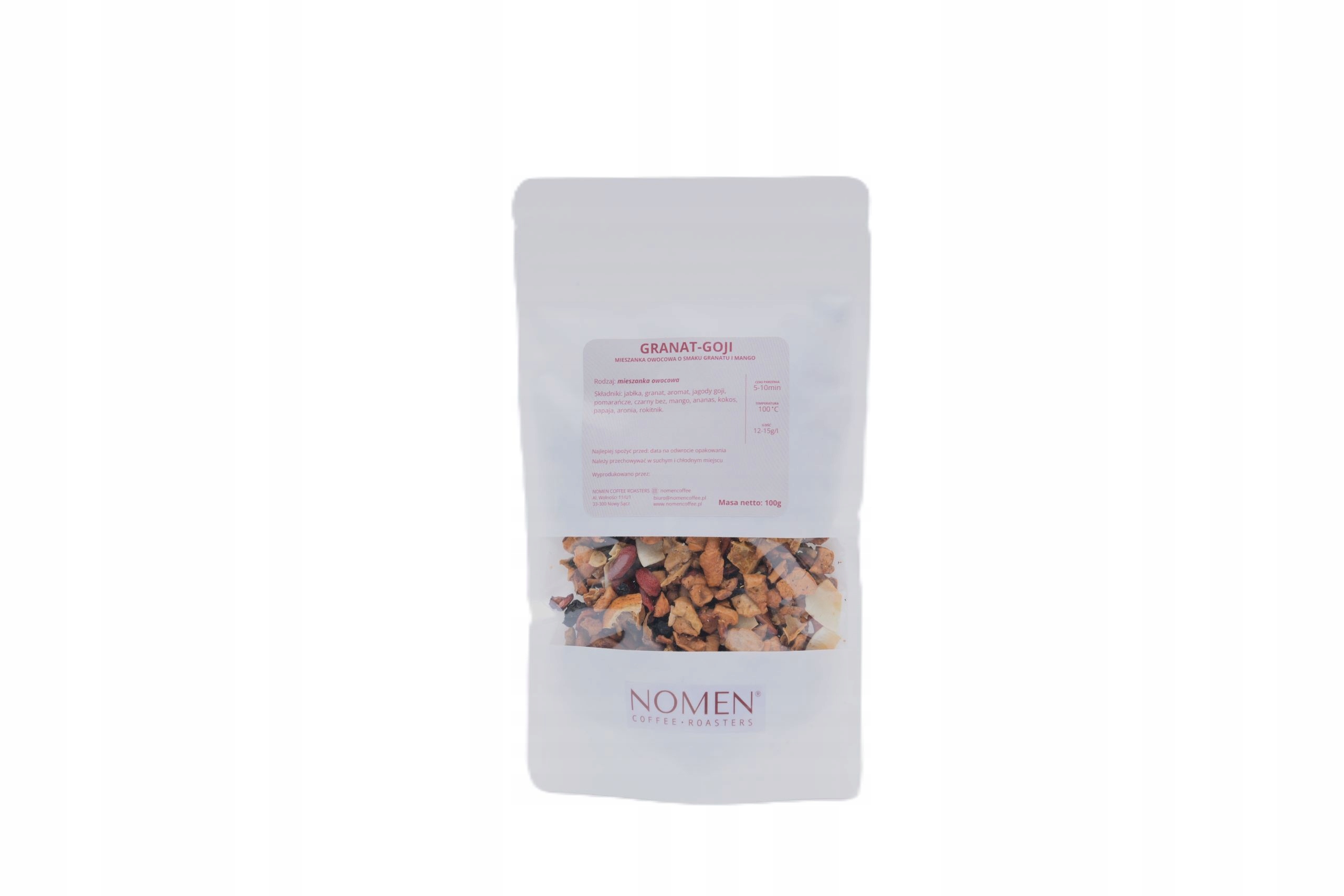 Skład: jabłka, granat, aromat, jagody goji, pomarańcze, czarny bez, mango, ananas, kokos, papaja, aronia, rokitnik