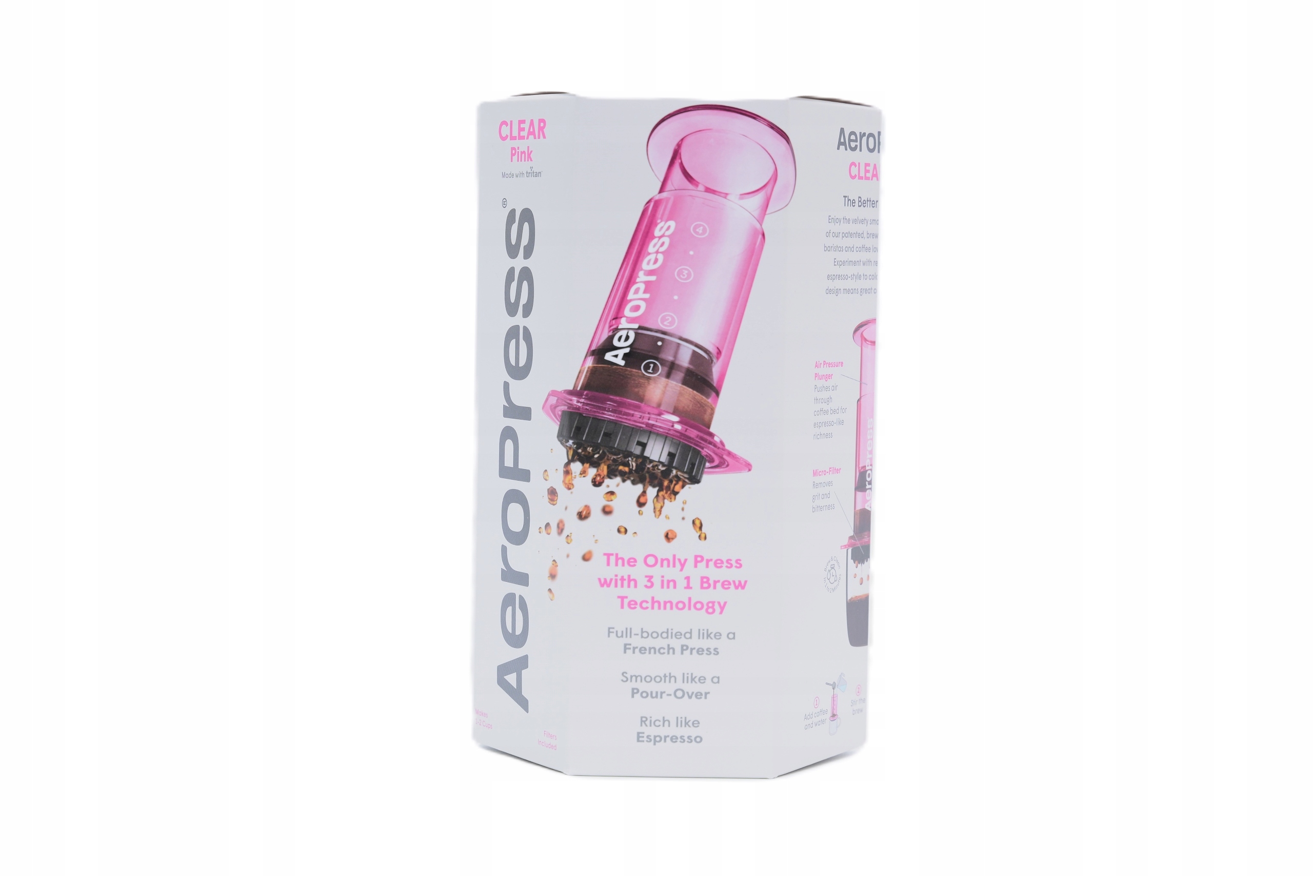 - Zawartość zestawu: AeroPress Clear Pink, 50 filtrów papierowych, mieszadło, miarka